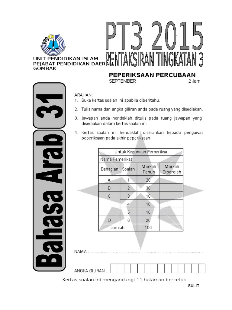 Providing the highest accuracy in studies and exam tips for spm pt3 & upsr. 2019 pt3 maths taman petaling. Posted on september 16, 2013 by soalanpercubaanpt3. Soalan trial bahasa arab pt3 2015. Bahasa melayu, bahasa inggeris, matematik, sains, pendidikan islam, kemahiran hidup, bahasa arab, bahasa cina.